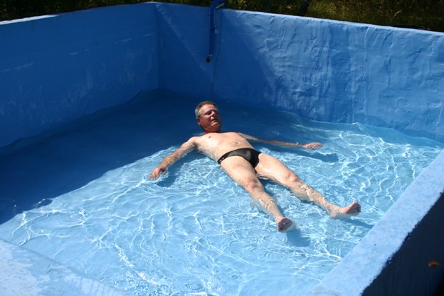 Het is eigenlijk te warm om te maaien, het is ruim 40 graden, maar het moet gebeuren. Als ik klaar ben met maaien en er al een klein laagje water in het zwembad is ga ik er languit in liggen om af te koelen. Heerlijk!
